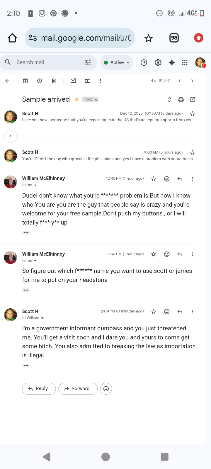 This Dr Dirt LLC dude just made threats against me and admitted to illegal importation even though it's a scam to discriminate, but look how confident he is. I want to press charges because he told me he would "fuck me up", sounds like a threat of violence. I get messed with over importing, Eden's gets messed with over importing, bouncing Bear gets messed with over importing , but this guy not only imports but makes death threats. Dude I'm a government informant. I wanna press charges. What an idiot. He's a freemason!! Occult!! Heres a screenshot of our email back and forth; Notice he callse crazy. https://stonedaimuser.neocities.org/a/Screenshot_20251215-141027.png This is exactly what Ryan sargent started to do after I was recruited by phytoextractum and after the witch didn't destroy me and I broke free.Sargent is the one that divides and gets LSD from a witch named Melissa because he thinks it gives him telepathy. He's the one who slandered me and told everyone that I put LSD in blake lockes drink(I'm certain it was him as he was the only one that could get it at the time). He's the creep who uses witchcraft on people he hates and has never had a girlfriend. He's in an illegitimate marriage right now with an Asian chick tied to those prostitutes and genocidal criminals in the Pensacola FBI DEA and the SRCSO.